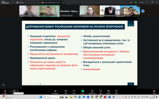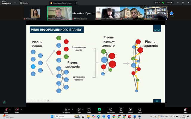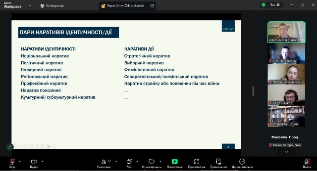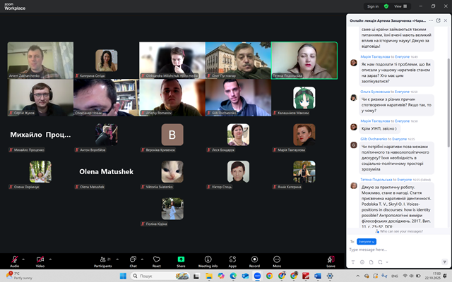 У середу, 22 жовтня, аспірант 2-го курсу ОНП «Географія» кафедри соціально-економічної географії і регіонознавства імені Костянтина Нємця Гліб ОВЧАРЕНКО долучився до лекції доктора наук з соціальних комунікацій Артема Захарченка «Наративи, які керують ідентичностями». Аспірант кафедри взяв активну участь у заході, зокрема у дискусії щодо творення наративу та політичної ідентичності. Також до заходу доєдналися доктор географічних наук, професор Катерина СЕГІДА та студент 2-го курсу ОПП «Економічна, соціальна географія та регіональний розвиток» Віктор СТЕЦЬ. Учасники дякують організаторам за цікаву та змістовну лекцію і за змогу обговорити актуальні й важливі питання.