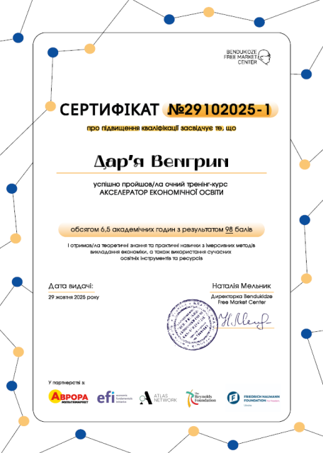 On October 29, 2025, Daria VENHRYN, a PhD student and a senior lecturer of the K. Niemets Department of Human Geography and Regional Studies, completed the full-time training course ECONOMIC EDUCATION ACCELERATER.