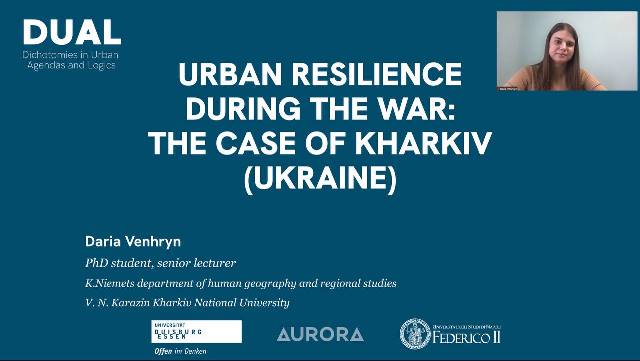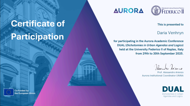 29 та 30 вересня 2025 року на кафедрі гуманітарних наук Неапольського університету Федеріко II (Італія), відбулася міжнародна академічна конференція Aurora “DUAL – Dichotomies in Urban Agendas and Logics“, захід проводився в рамках програми Європейської університетської ініціативи Aurora 2030.