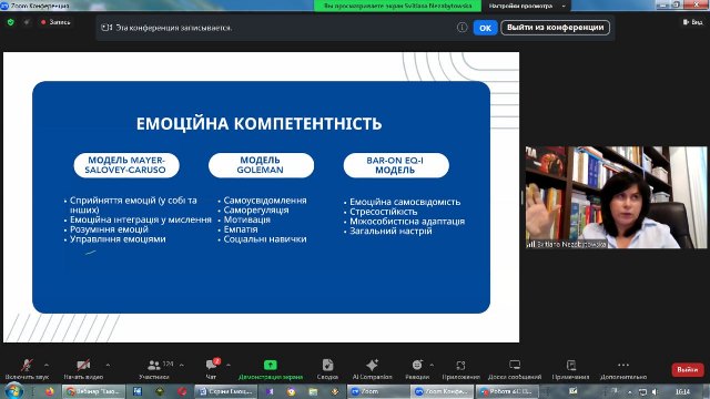 В ході вебінару розглядалися актуальні питання психології у відносинах викладачів і студентів, зокрема, моделі психологічної емоційної компетентності викладача, риси психологічного портрету сучасного студента, роль психоедукації як інструменту зміцнення ментального здоров'я учасників освітнього процесу, прояви емоційного лідерства в аудиторії.