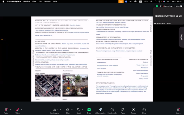 27 листопада 2025 р. відбувся другий вебінар в рамках проєкту «Міський хакатон з ревіталізації просторів студентських кампусів», що реалізується за фінансової підтримки Міжнародного Вишеградського Фонду у межах програми V4 Gen Mini-Grant.