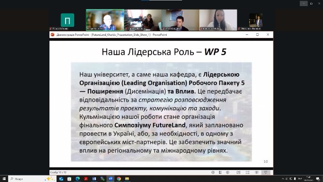 Під час семінару було обговорено зміст проєкту, роль кафедри у його виконанні (кафедра є провідним партнером за реалізацію робочого пакету 5 «Вплив та поширення результатів проєкту») та вироблено спільну позицію щодо реалізації проєкту.