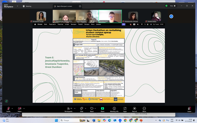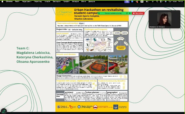 Студенти кафедри Ольга Подпрятова, Орест Дуніков, Оксана Апанасенко розповіли про насичені дні програми, досвід роботи в міждисциплінарних командах та презентували свої готові проекти відновлення Каразінського спорт комплексу.