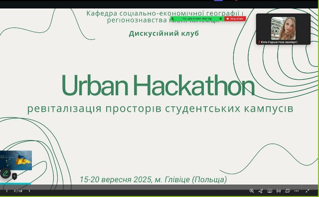 1 жовтня 2025 р. в рамках дискусійно клубу, організованого кафедрою соціально-економічної географії і регіонознавства імені Костянтина Нємця, студенти кафедри мали змогу поділитися своїм досвідом участі в проекті "Urban Hackathon з ревіталізації просторів студентських кампусів». Проект був реалізований в рамках грантової програми V4 Gen Mini-Grant, що фінансується Вишеградським фондом.