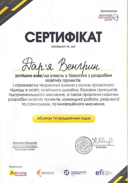 Венгрин Дарʼя Володимирівна, старший викладач кафедри соціально-економічної географії та регіонознавства імені Костянтина Нємця, долучилася до роботи пілотного Хакатону освітніх проєктів від Bendukidze Free Market Center, що відбувся 28–29 березня 2026 року в Києві. Захід об’єднав освітян з різних регіонів України та став платформою для створення інноваційних рішень у сфері економічної та фінансової грамотності, спрямованих на оновлення змісту освіти та посилення її практичної складової.