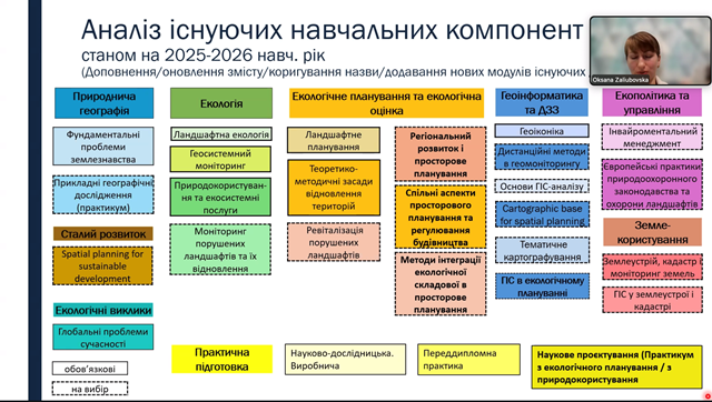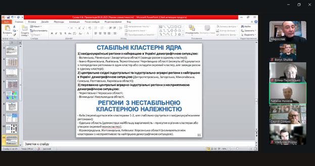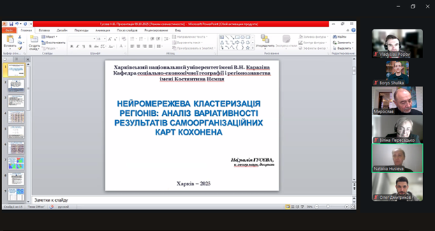 Доцент кафедри, к. геогр. наук Наталія ГУСЄВА виступила з доповіддю «Нейромережева кластеризація регіонів: аналіз варіативності результатів самоорганізаційних карт Кохонена».