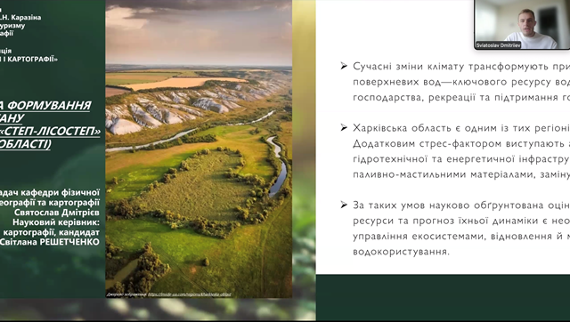 Професор кафедри, д. геогр. наук Катерина СЕГІДА та аспірант Костянтин МАЛЯРЕНКО представили доповідь «До питання оцінки економічної складової розвитку території».